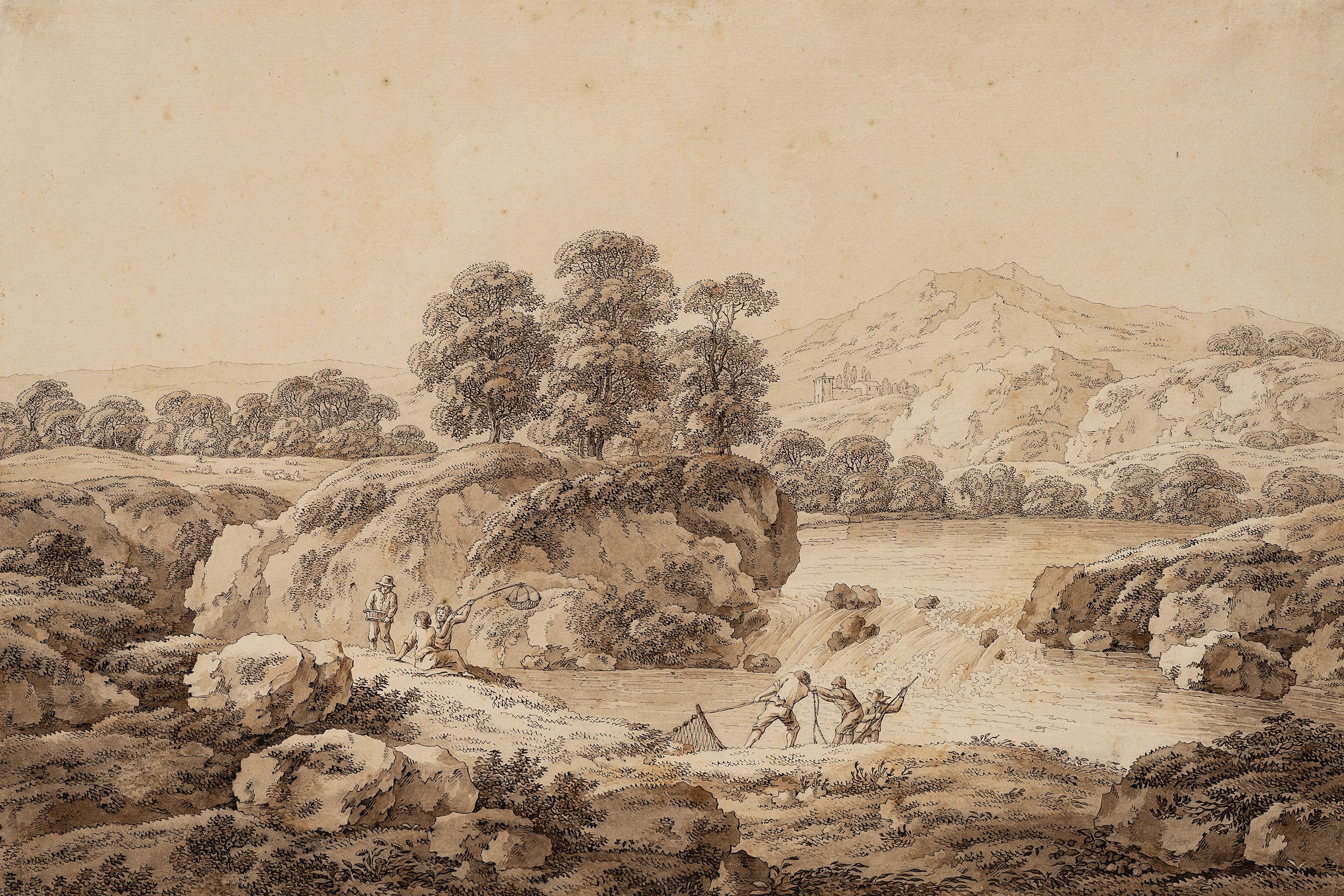 Adrian Zingg (1734 St. Gallen – Leipzig 1816): Flusslandschaft mit Fischern an einem Wasserfall, um 1780, lavierte Federzeichnung