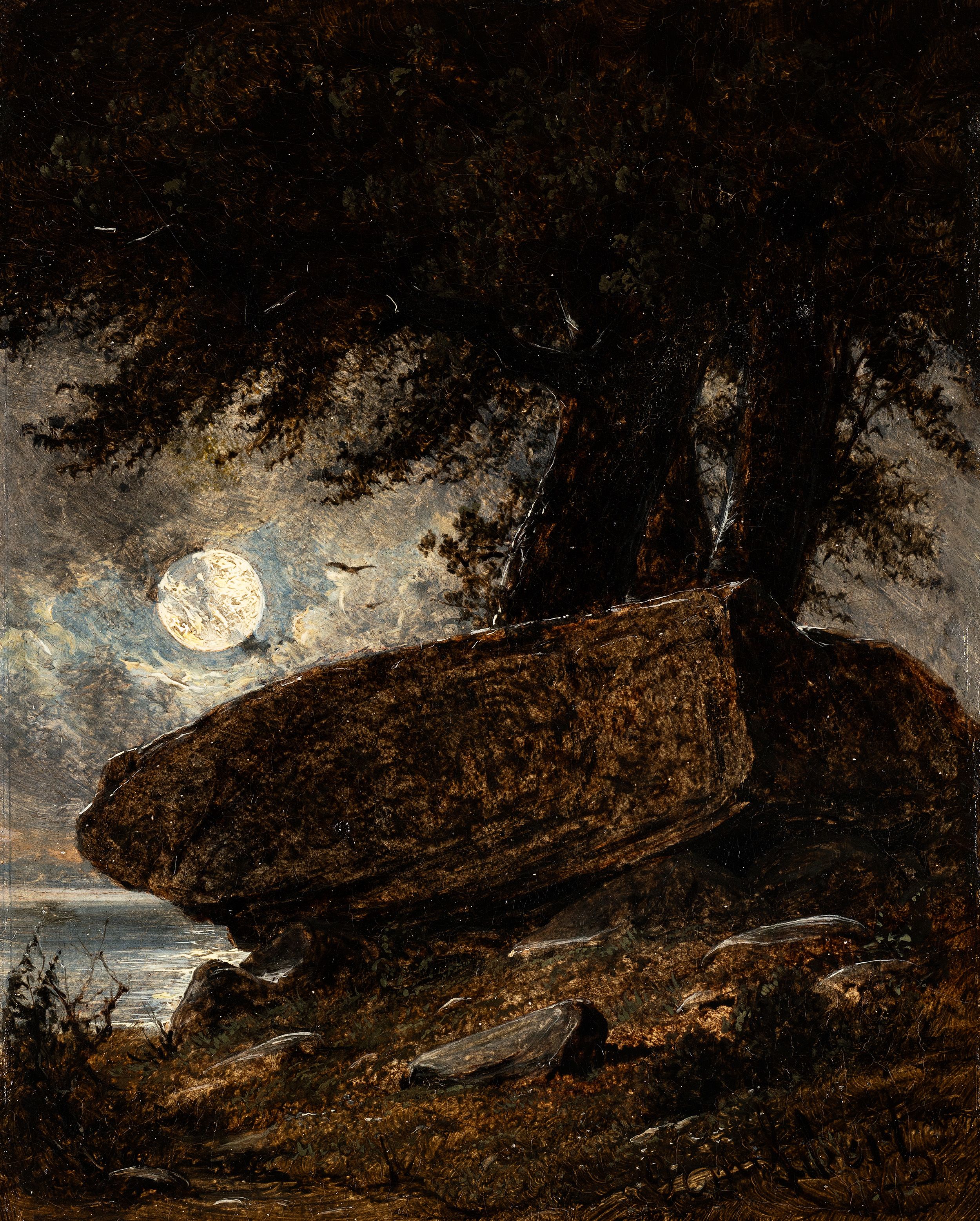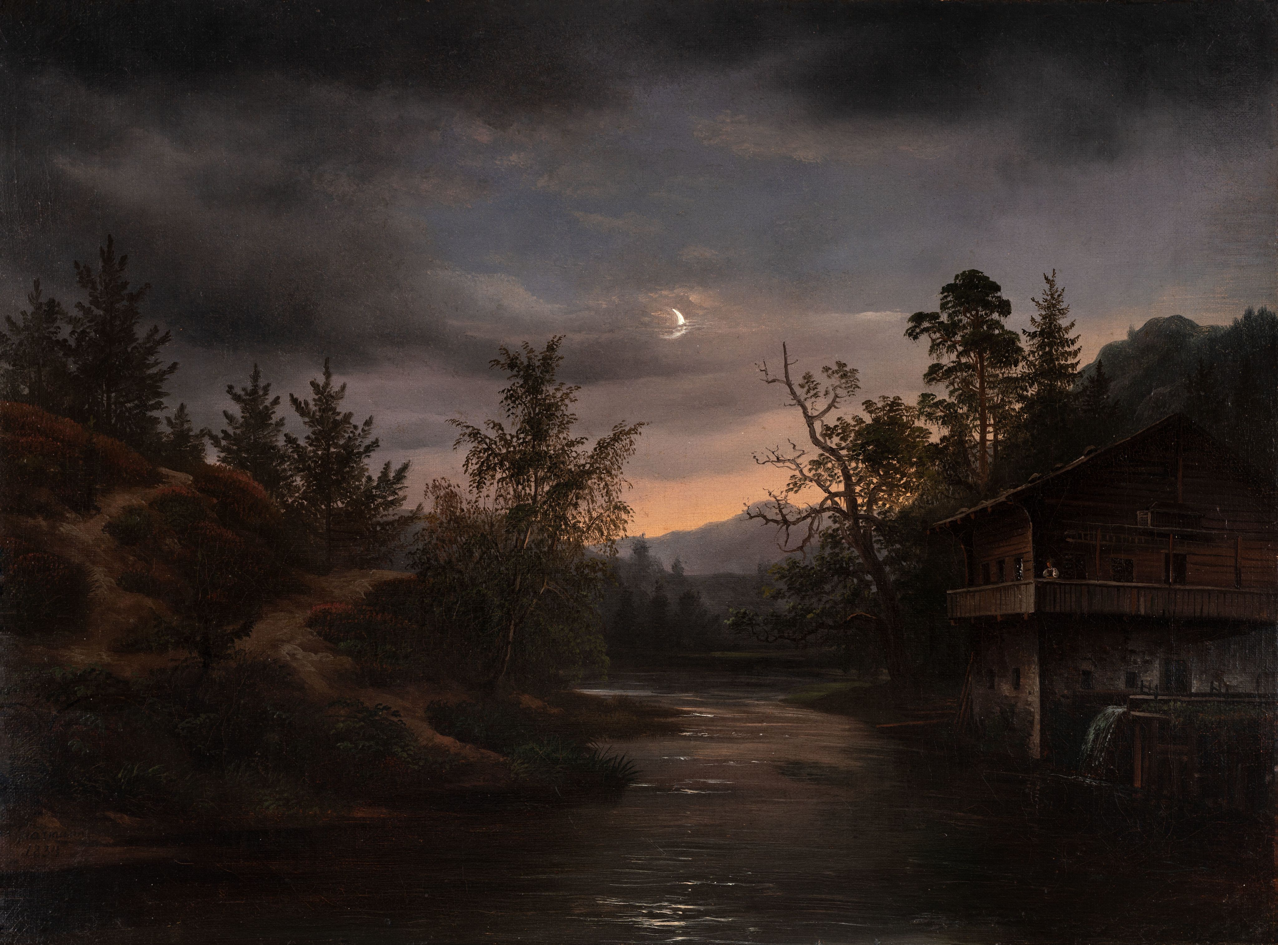 Karl Christian Sparmanns (1805–1864), Mondscheinlandschaft zeigt eine poetische Abendstimmung, in der Tag und Nacht aufeinandertreffen. Ein Bach reflektiert das Licht einer Mondsichel, während die umgebenden Bäume noch vom letzten Licht des Tages erleuchtet sind. Die genaue Naturbeobachtung erinnert stark an Dahl, während die romantische Stimmung auf Friedrichs Einfluss zurückzuführen ist.
