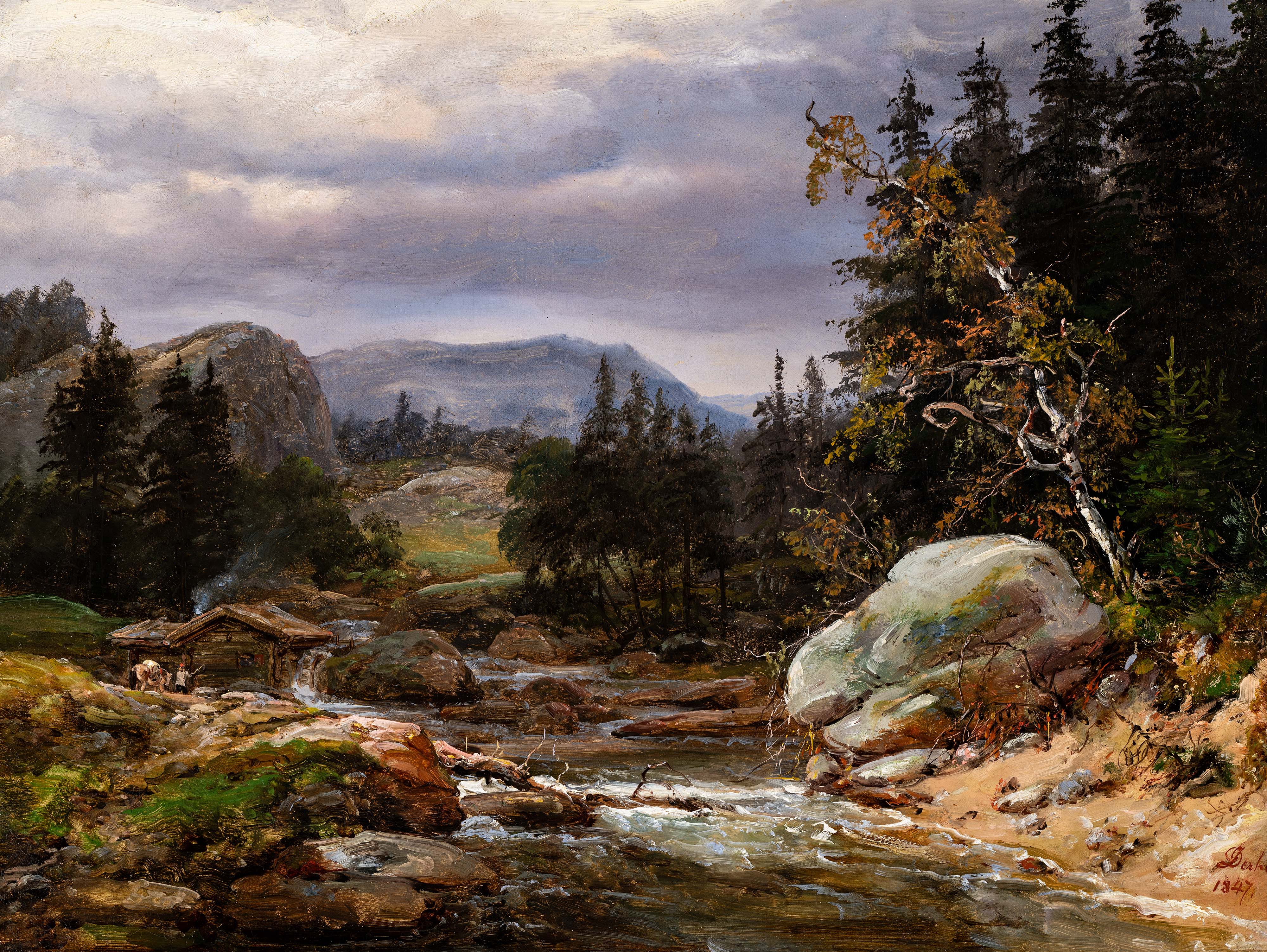 Ein besonders eindrucksvolles Werk ist seine Norwegische Landschaft. Die düstere, aufgewühlte Stimmung, die durch den massiven Felsen und den starken Strom des Flusses erzeugt wird, lässt die Dramatik der norwegischen Natur spüren. Eine Mühle am Ufer, eingerahmt von Tannen, gibt dem Bild eine narrative Ebene, während der Blick des Betrachters auf ein majestätisches Gebirge gelenkt wird. Dahls malerischer Realismus schafft eine poetische, heroische Landschaft, die er als charakteristisch für seine norwegische Heimat empfand.