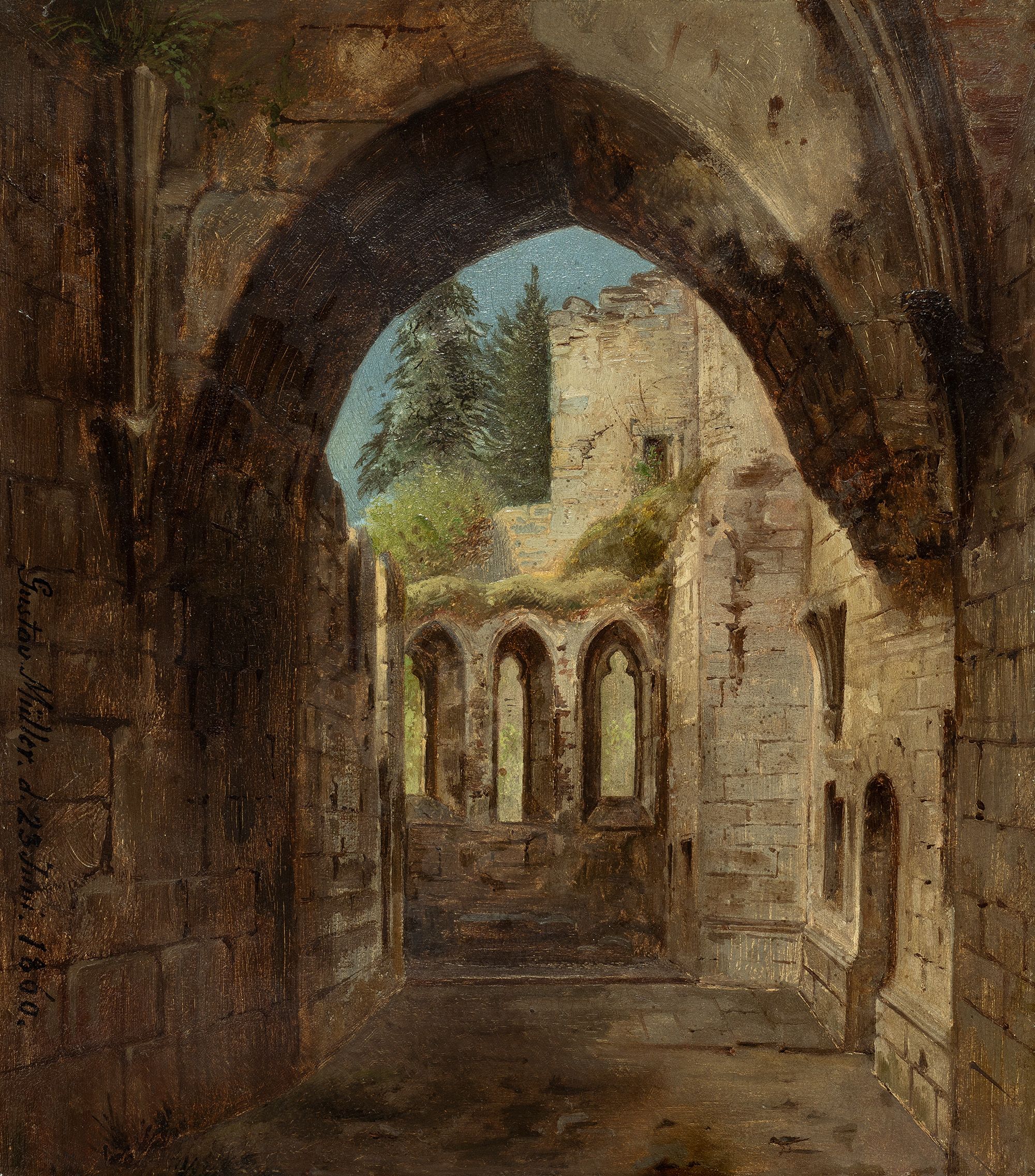 Auch Gustav Otto Müller (1827–1922), der von 1842 bis 1846 an der Dresdner Akademie studierte, zeigt in seinen Werken eine realistische Prägung. Obwohl das Blau des Himmels noch an die romantische Tradition erinnert, überwiegt in Müllers Sakristei der Klosterkirche auf dem Oybin die nüchterne Beschreibung der Architektur. Er rückt die Sakristei als Ganzes in den Fokus und schafft dabei ein Nebeneinander von Innen- und Außenansicht.