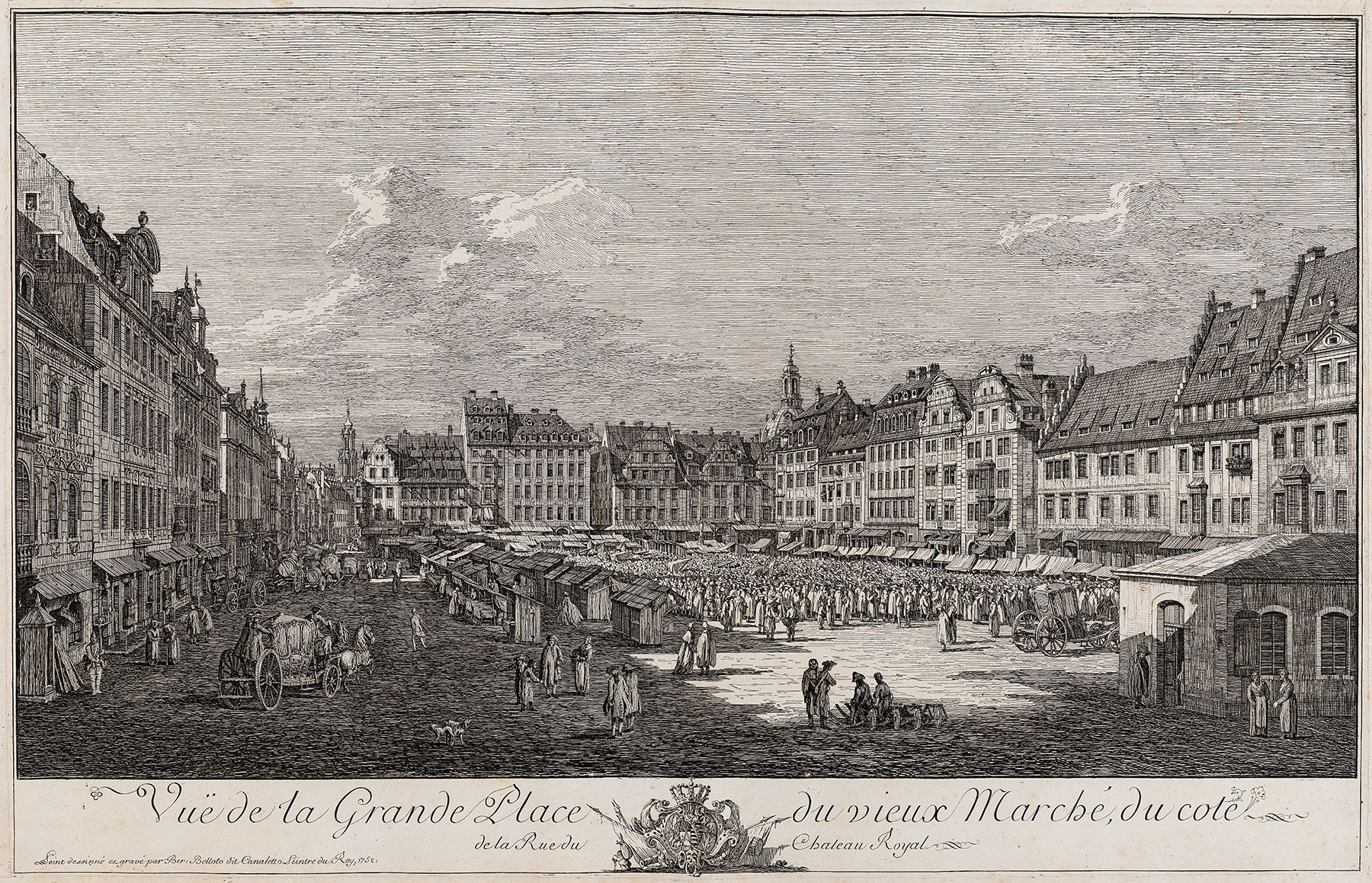Bernardo Bellotto, genannt Canaletto (1722 Venedig–1780 Warschau), Ansicht des Alten Marktes in Dresden, 1752, Radierung