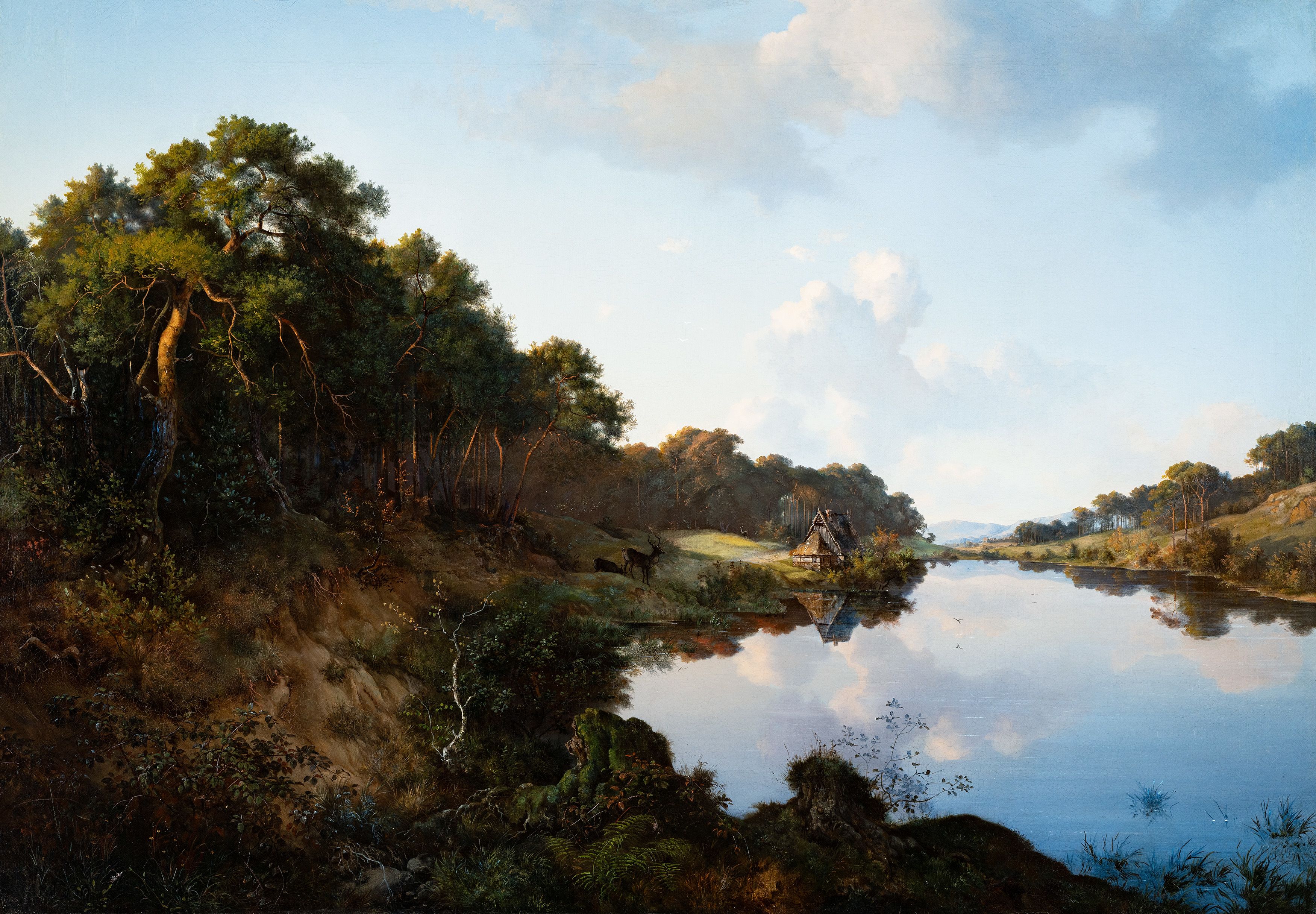 Ernst Ferdinand Oehme (1797 Dresden – 1855): Sächsische Landschaft mit See und Hütte, 1839, Öl